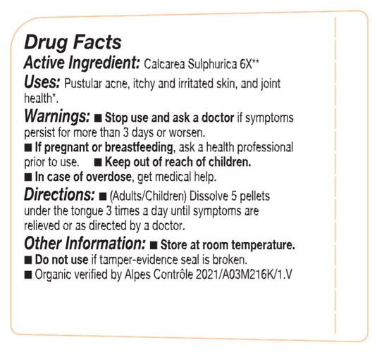 - Calcarea Sulphurica : Traditionally used for temporary relief from pustular acne, itchy and irritated skin, and joint health
