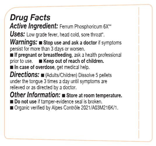 - Ferrum Phosphoricum : Traditionally used for temporary relief from low grade fever, head cold, sore throat