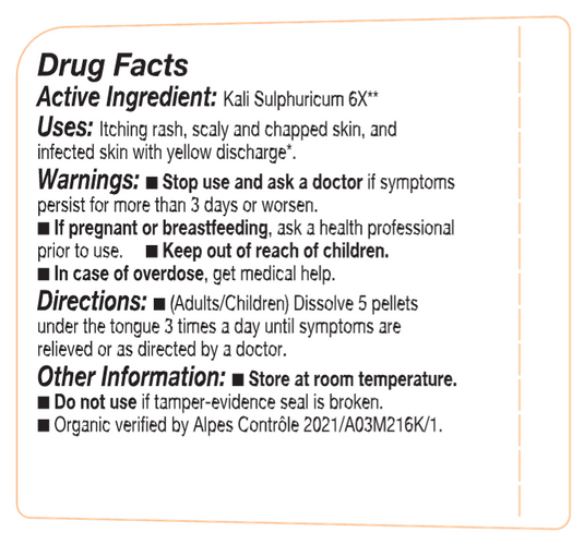 - Kali Sulphuricum : Traditionally used for temporary relief from itching rash, scaly and chapped skin, and infected skin with yellow discharge