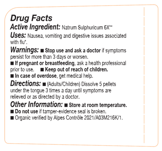 Natrum Sulphuricum : Traditionally used for temporary relief from nausea, vomiting and digestive issues associated with flu