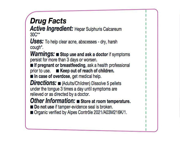 - Hephar sulphuris Calcareum 30c : To help clear acne, abscesses - dry, harsh cough.