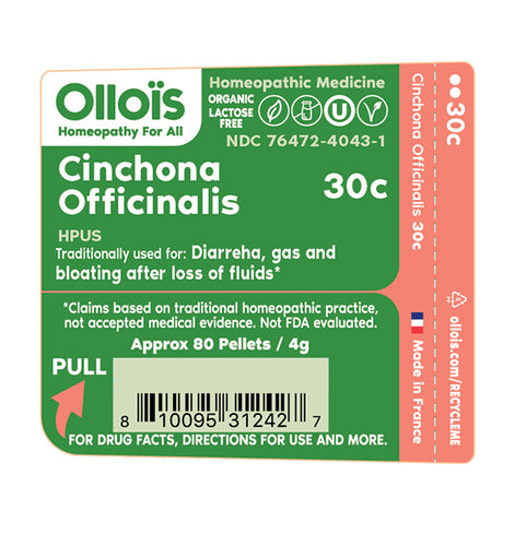 - Cinchona Officinalis 30C: gas pain, bloating, and diarrhea after loss of fluids.*